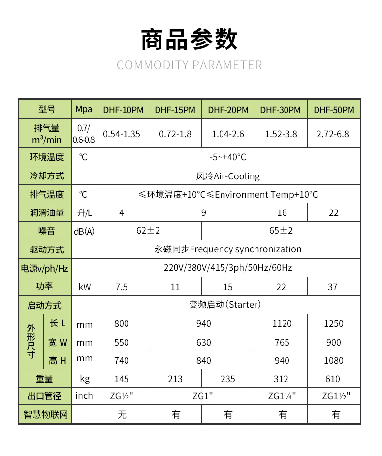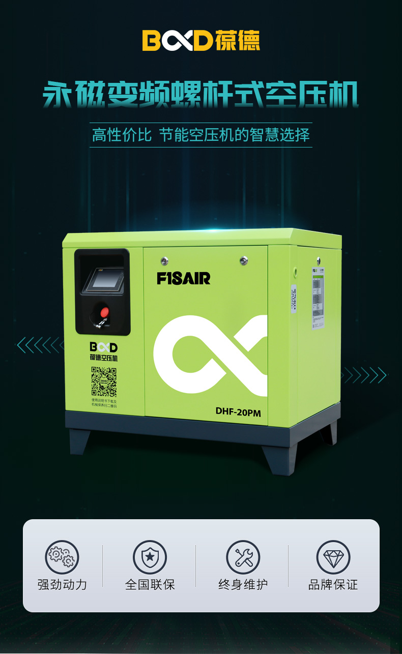 大黃蜂永磁變頻空壓機特點:永磁同步電機采用釹鐵硼永磁體,葆德一體式主機,新一代型線設計,低噪音,低維護費用,可靠,穩定,型號:DHF-10PM、DHF-15PM、DHF-20PM、DHF-30PM